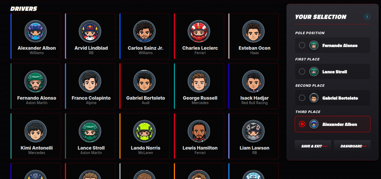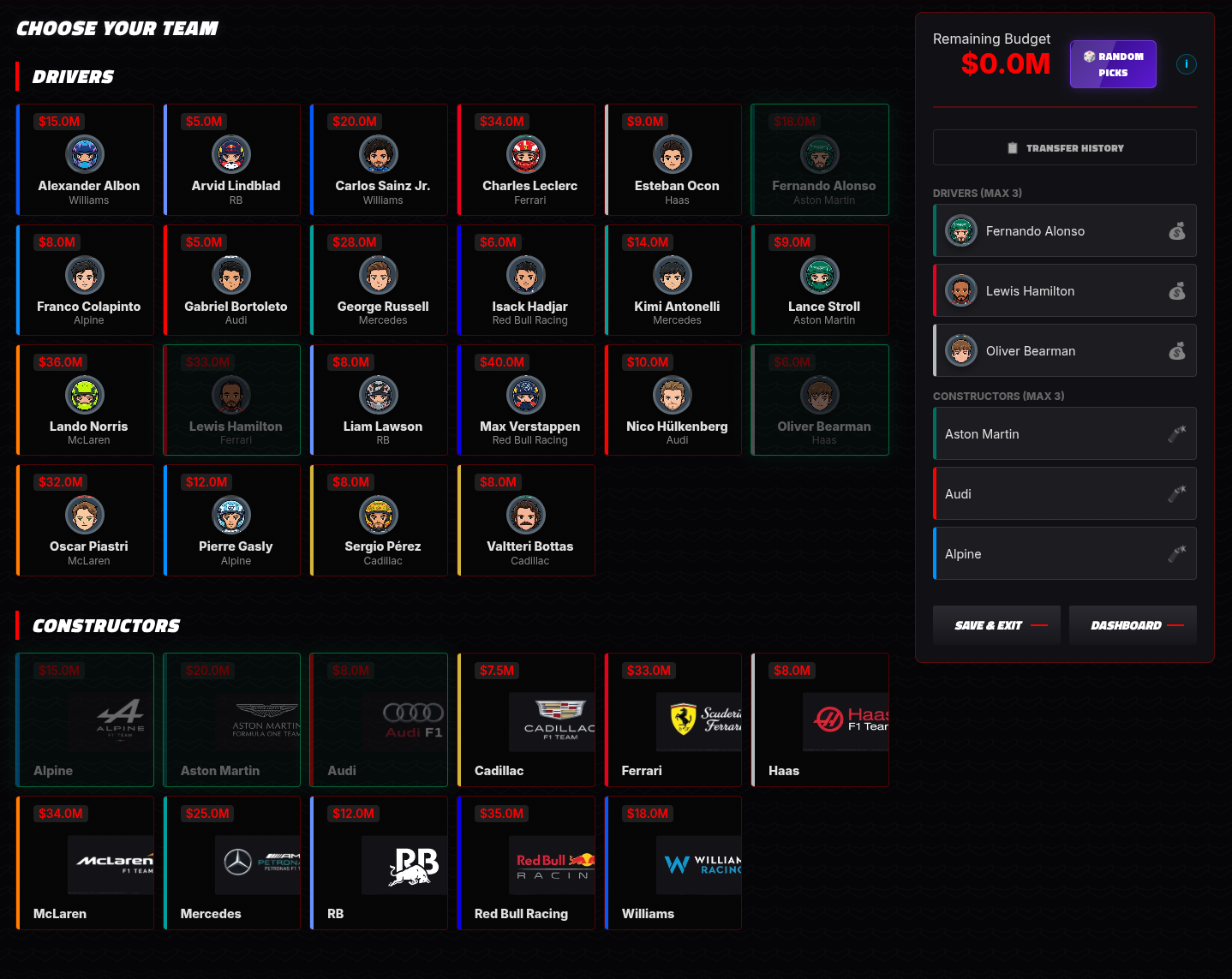 draft your favorite Formula 1 drivers and constructor teams before the lock-out period begins.